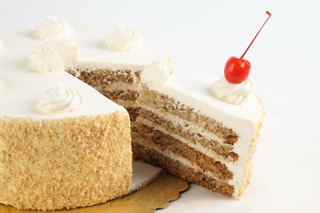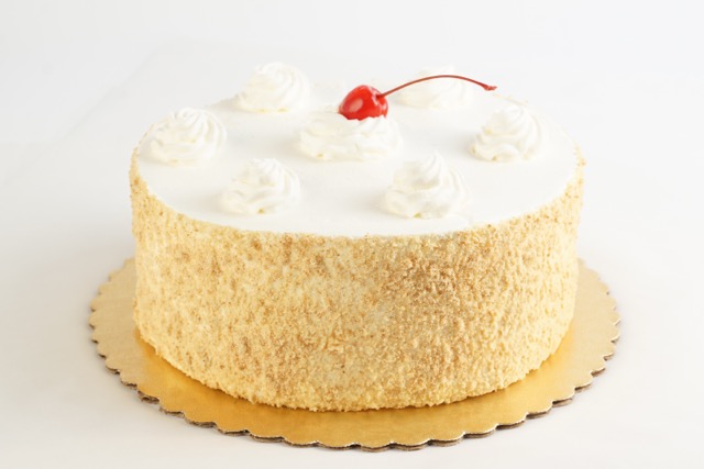 Banana cake layered with smooth banana cream, frosted in fluffy whipped cream, coated in golden graham crumbs, and finished with swirls of cream and a classic cherry on top. A nostalgic favorite with a bakery twist.