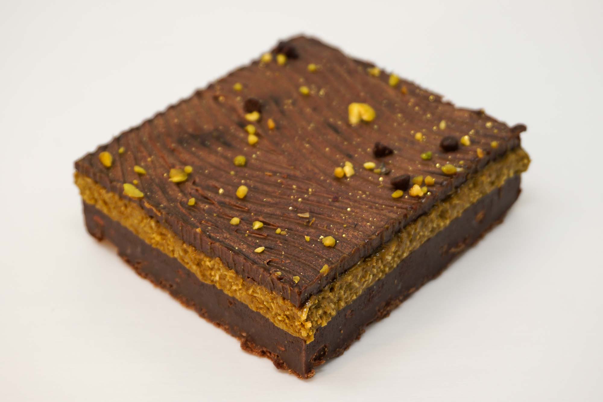 Layers of rich chocolate brownie, smooth pistachio cream, and crisp kataifi for a subtle crunch. Finished with glossy ganache, a sprinkle of crushed pistachios, and a hint of gold shimmer. Decadent and refined, with just the right touch of flair.